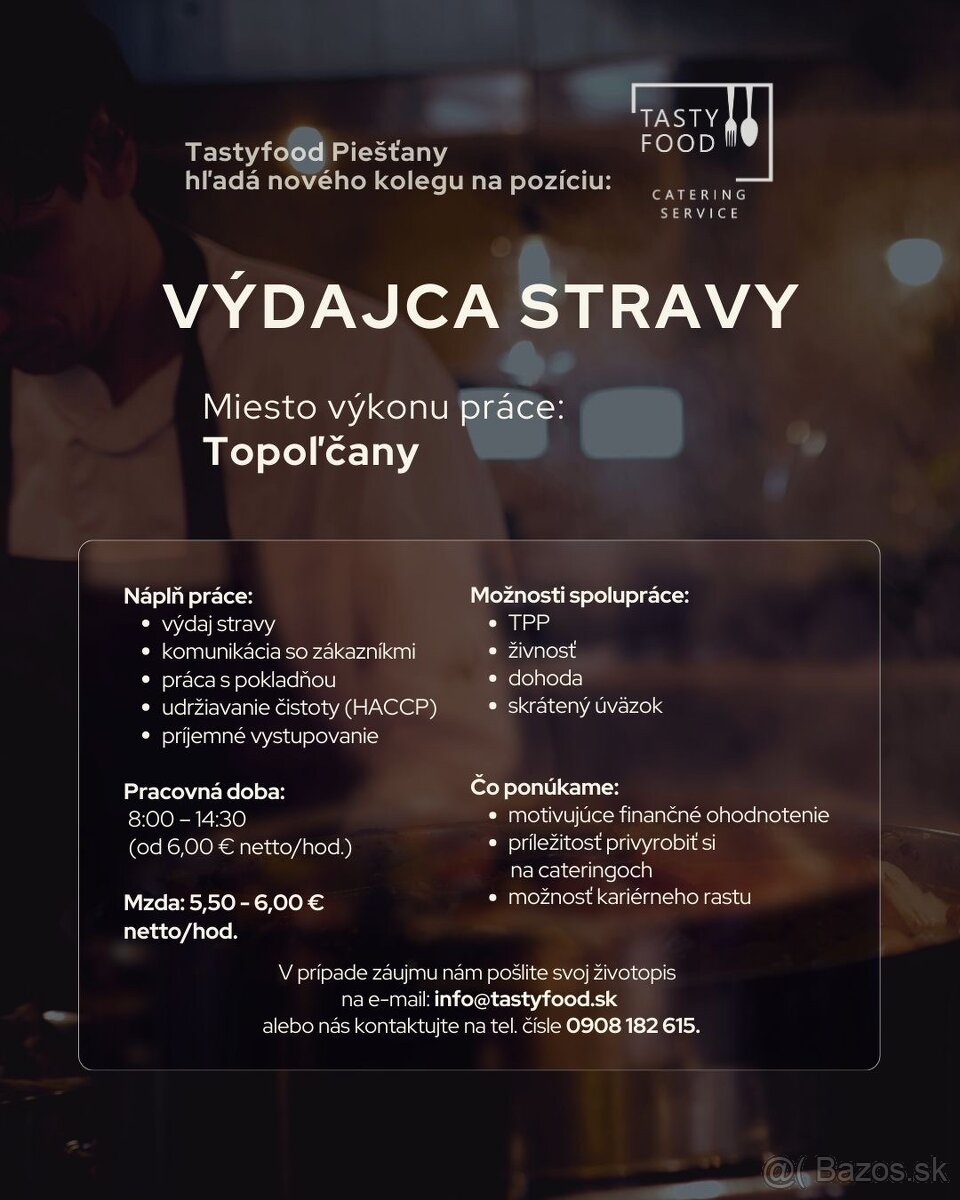 Výdajca stravy / pomocná sila do kuchyne - [8.3. 2026]poločnosť Tasty Food prijme do pracovného pomeru pracovníčku na výdaj stravy, pomocné práce na výdaji na prevádzku v Potvoriciach.